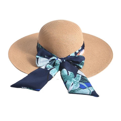 Của phụ nữ màu in satin rộng vành mũ rơm với phim hoạt hình hoa mẫu rộng vành mũ rơm Băng Giấy bện bãi biển